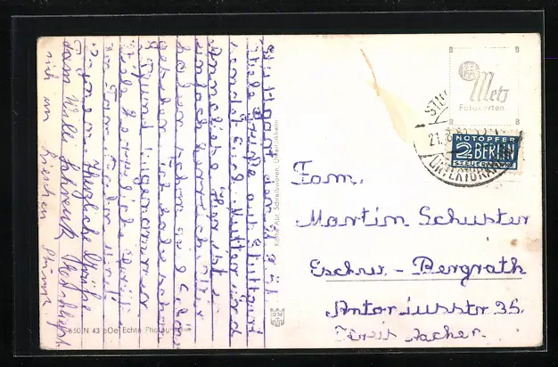 Personenbezogene Daten auf der Rückseite der Karte wurden durch blauen Textmarker unkenntlich gemacht. Die blauen Stellen sind auf die Vorderseite durchgeweicht und wirken sich negativ auf das Postkartenfoto aus