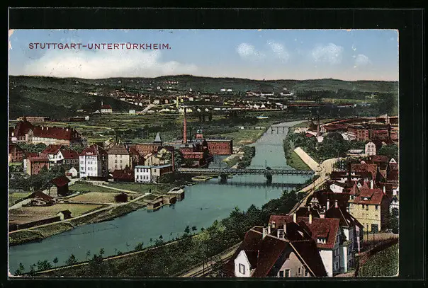 AK Stuttgart-Untertürkheim, Totalansicht mit Brücke