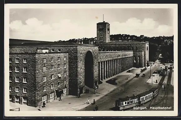 AK Stuttgart, Vorderansicht Hauptbahnhof, Strassenbahn