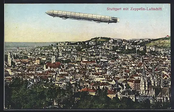 AK Stuttgart, Zeppelin-Luftschiff über der Stadt