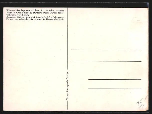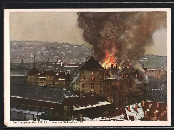 AK Stuttgart, das Alte Schloss brennt Weihnachten 1931