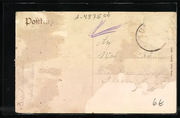 Personenbezogene Daten auf der Rückseite der Karte wurden durch blauen Textmarker unkenntlich gemacht. Die blauen Stellen sind auf die Vorderseite durchgeweicht und wirken sich negativ auf das Postkartenfoto aus