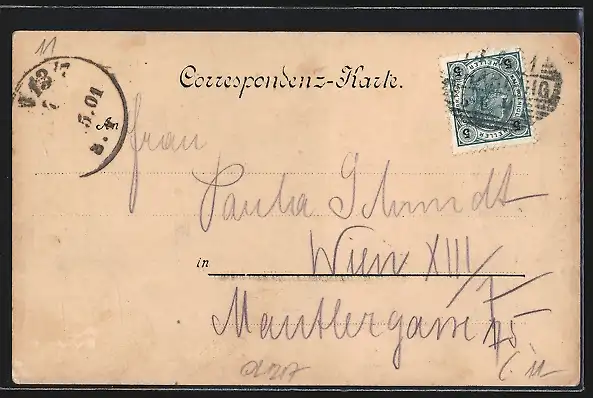 gelaufen 1901, Briefmarke entfernt, Eckknick li. unten, guter Zustand