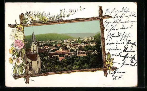 Personenbezogene Daten auf der Rückseite der Karte wurden durch blauen Textmarker unkenntlich gemacht. Die blauen Stellen sind auf die Vorderseite durchgeweicht und wirken sich negativ auf das Postkartenfoto aus