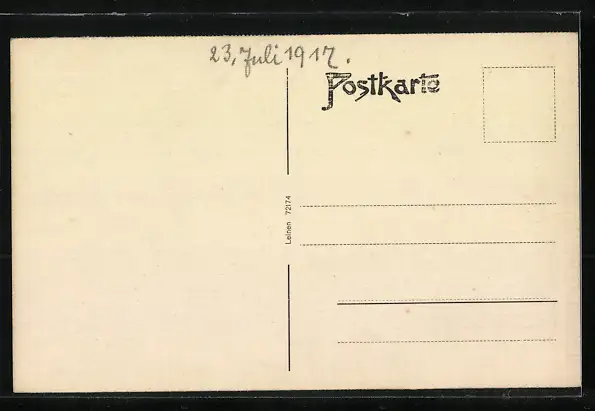 Personenbezogene Daten auf der Rückseite der Karte wurden durch blauen Textmarker unkenntlich gemacht. Die blauen Stellen sind auf die Vorderseite durchgeweicht und wirken sich negativ auf das Postkartenfoto aus