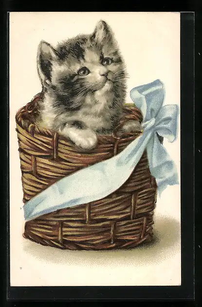 AK Süsse Katze in einem Weidenkorb mit Schleife