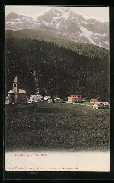 AK Sulden, Ortsansicht mit der Kirche gegen den Ortler