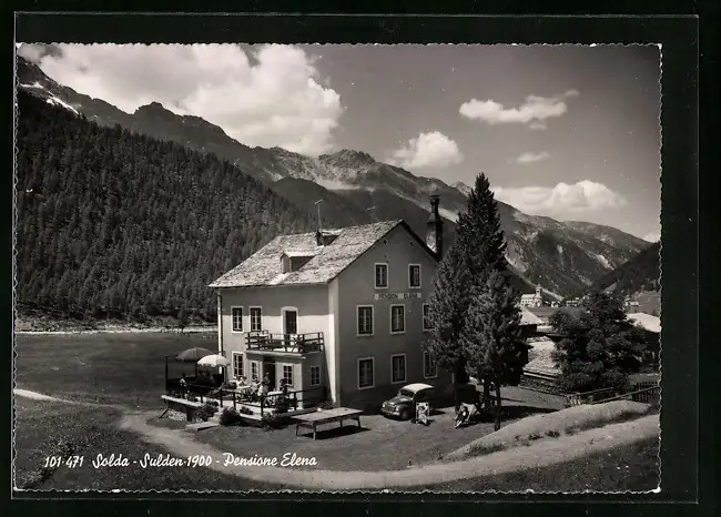 AK Sulden, Pensione Elena mit Terrasse aus der Vogelschau