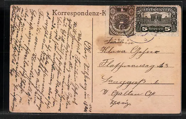Personenbezogene Daten auf der Rückseite der Karte wurden durch blauen Textmarker unkenntlich gemacht. Die blauen Stellen sind auf die Vorderseite durchgeweicht und wirken sich negativ auf das Postkartenfoto aus