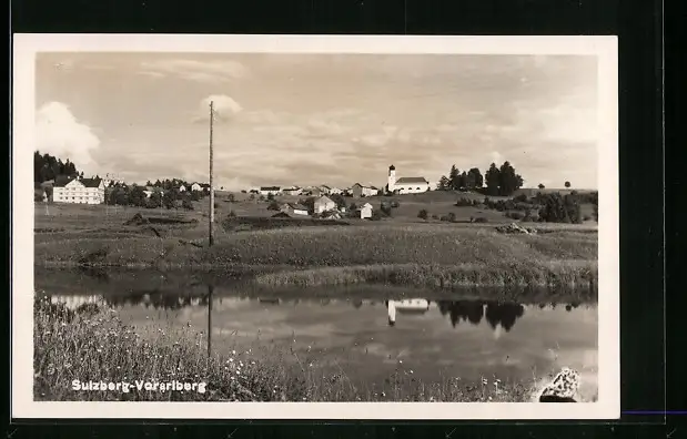 AK Sulzberg, Ortspanorama hinter Gewässer und Feldern