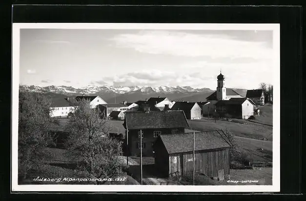 AK Sulzberg, Teilansicht mit Kirche und Alpen im Hintergrund