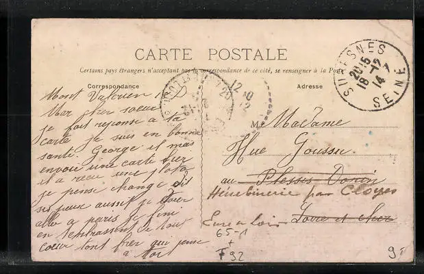Personenbezogene Daten auf der Rückseite der Karte wurden durch blauen Textmarker unkenntlich gemacht. Die blauen Stellen sind auf die Vorderseite durchgeweicht und wirken sich negativ auf das Postkartenfoto aus
