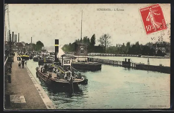 AK Suresnes, L`écluse, Lastkähne an der Schleuse