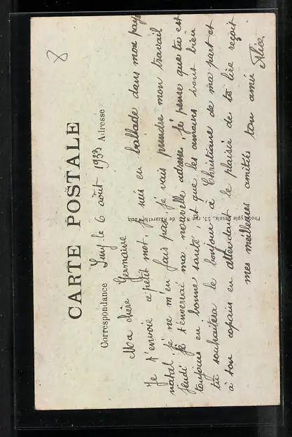 Personenbezogene Daten auf der Rückseite der Karte wurden durch blauen Textmarker unkenntlich gemacht. Die blauen Stellen sind auf die Vorderseite durchgeweicht und wirken sich negativ auf das Postkartenfoto aus