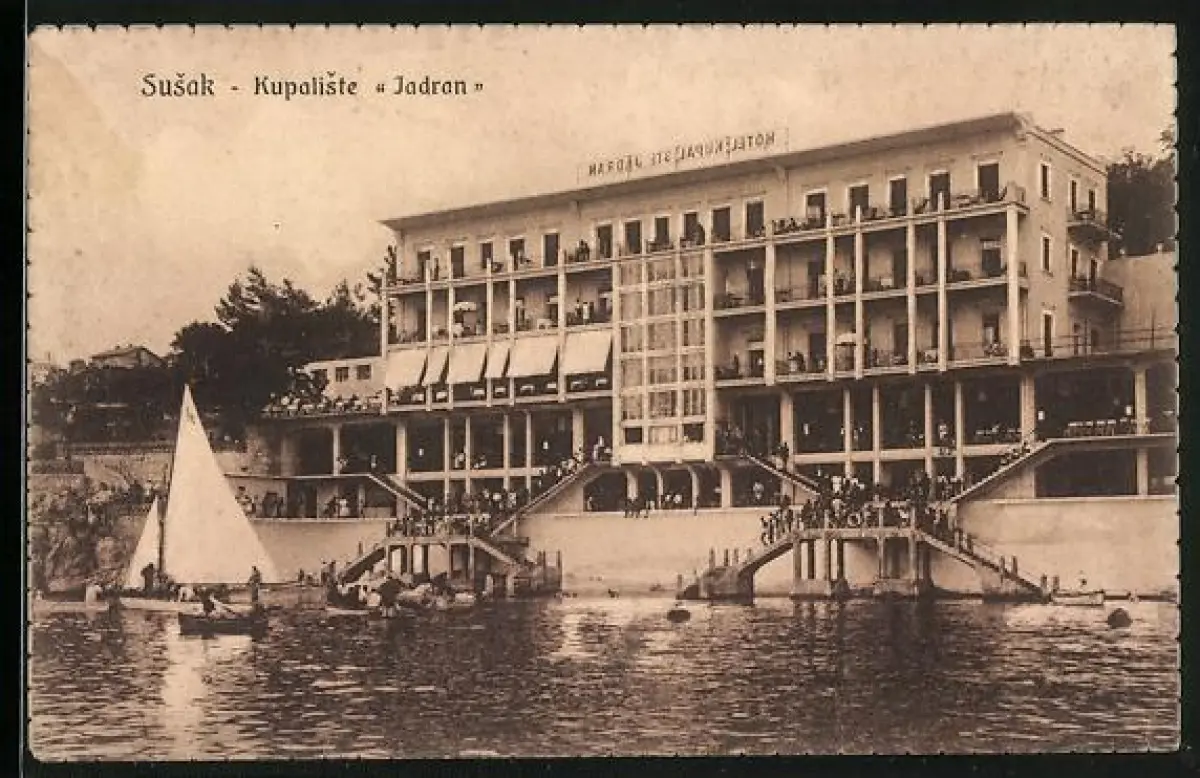 AK Susak, Hotel Kupaliste Jadran, davor Segelboot