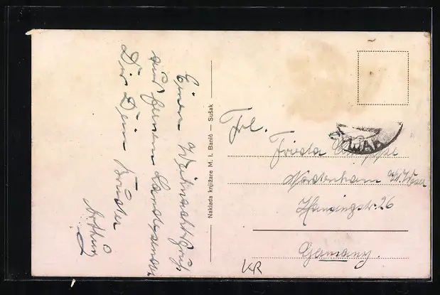 Personenbezogene Daten auf der Rückseite der Karte wurden durch blauen Textmarker unkenntlich gemacht. Die blauen Stellen sind auf die Vorderseite durchgeweicht und wirken sich negativ auf das Postkartenfoto aus