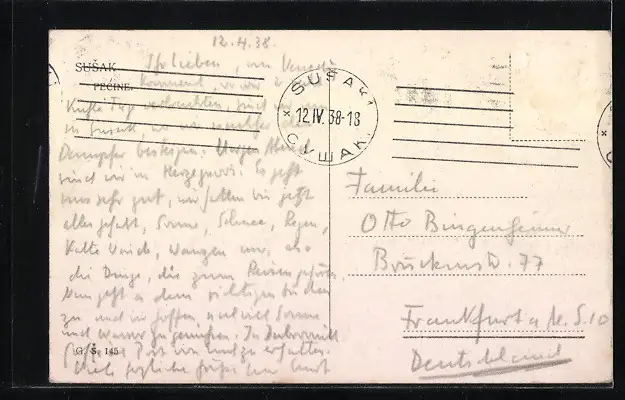 gelaufen 1938, Briefmarke tw. entfernt, rückseitig Oberflächenschaden, guter Zustand