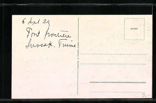 Personenbezogene Daten auf der Rückseite der Karte wurden durch blauen Textmarker unkenntlich gemacht. Die blauen Stellen sind auf die Vorderseite durchgeweicht und wirken sich negativ auf das Postkartenfoto aus