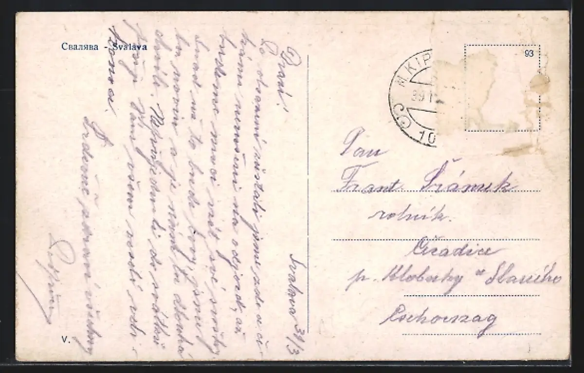 Personenbezogene Daten auf der Rückseite der Karte wurden durch blauen Textmarker unkenntlich gemacht. Die blauen Stellen sind auf die Vorderseite durchgeweicht und wirken sich negativ auf das Postkartenfoto aus