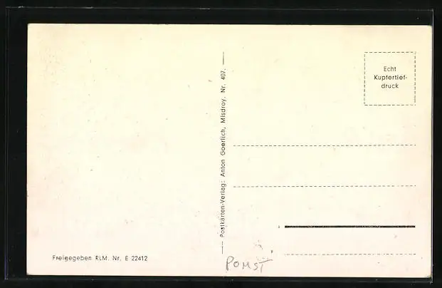 Personenbezogene Daten auf der Rückseite der Karte wurden durch blauen Textmarker unkenntlich gemacht. Die blauen Stellen sind auf die Vorderseite durchgeweicht und wirken sich negativ auf das Postkartenfoto aus