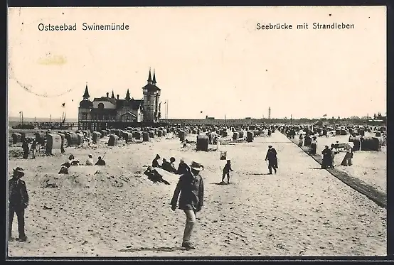 AK Swinemünde, Seebrücke mit Strandleben