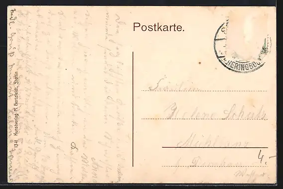 alte Ansichtskarte, gelaufen, Briefmarke entfernt, rückseitig Oberflächenschaden, guter Zustand