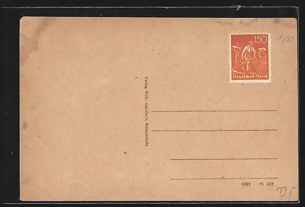 Personenbezogene Daten auf der Rückseite der Karte wurden durch blauen Textmarker unkenntlich gemacht. Die blauen Stellen sind auf die Vorderseite durchgeweicht und wirken sich negativ auf das Postkartenfoto aus
