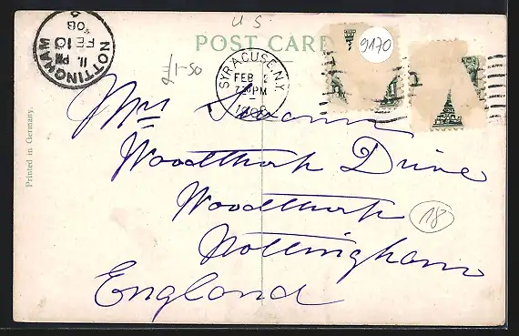 gelaufen 1908, Briefmarke entfernt, guter Zustand