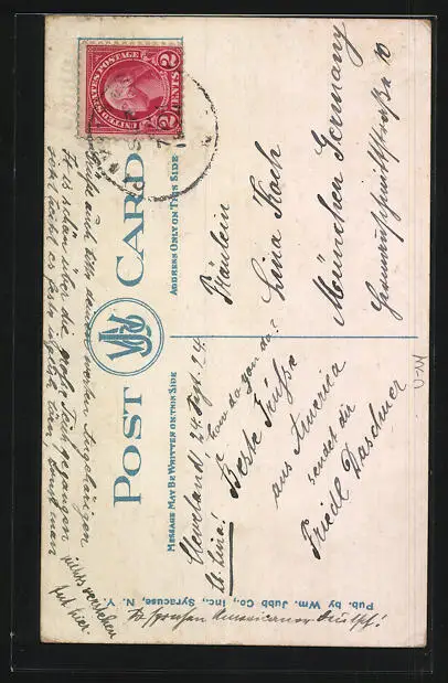 Personenbezogene Daten auf der Rückseite der Karte wurden durch blauen Textmarker unkenntlich gemacht. Die blauen Stellen sind auf die Vorderseite durchgeweicht und wirken sich negativ auf das Postkartenfoto aus