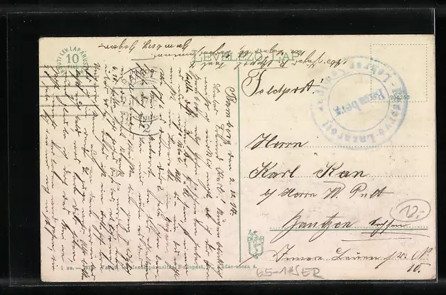 Personenbezogene Daten auf der Rückseite der Karte wurden durch blauen Textmarker unkenntlich gemacht. Die blauen Stellen sind auf die Vorderseite durchgeweicht und wirken sich negativ auf das Postkartenfoto aus