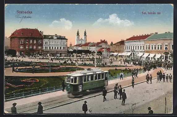 AK Szabadka, Szt. István tér, Ortspartie mit Strassenbahn