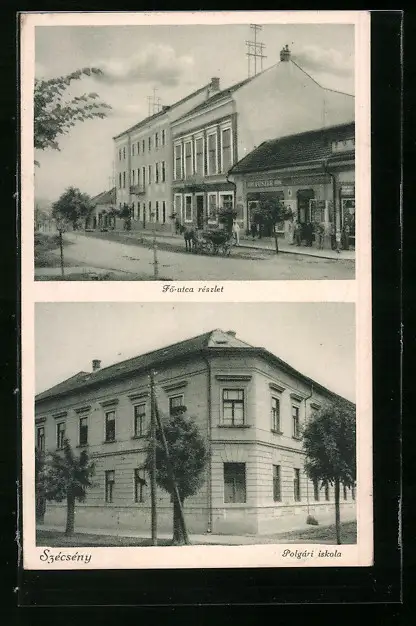 AK Szécsény, Fö-utca részlet, Polgári iskola