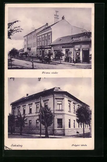 AK Szecseny, Fö-utca reszlet, Polgari iskola