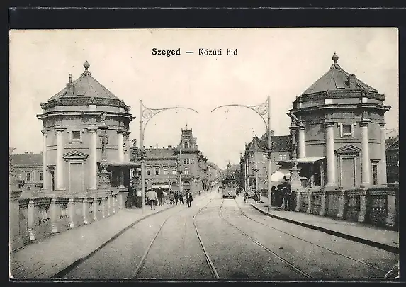 AK Szeged, Közuti hid, Strassenansicht mit Strassenbahn