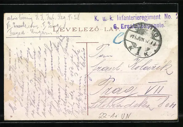 Personenbezogene Daten auf der Rückseite der Karte wurden durch blauen Textmarker unkenntlich gemacht. Die blauen Stellen sind auf die Vorderseite durchgeweicht und wirken sich negativ auf das Postkartenfoto aus