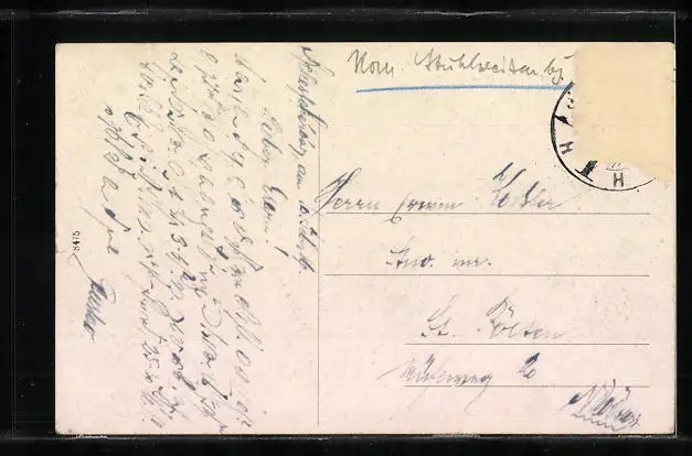 Personenbezogene Daten auf der Rückseite der Karte wurden durch blauen Textmarker unkenntlich gemacht. Die blauen Stellen sind auf die Vorderseite durchgeweicht und wirken sich negativ auf das Postkartenfoto aus