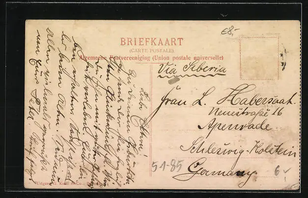 Personenbezogene Daten auf der Rückseite der Karte wurden durch blauen Textmarker unkenntlich gemacht. Die blauen Stellen sind auf die Vorderseite durchgeweicht und wirken sich negativ auf das Postkartenfoto aus
