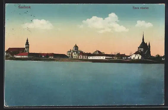 AK Szolnok, Tisza részlet, Blick vom Wasser zur Synagoge