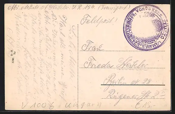 Personenbezogene Daten auf der Rückseite der Karte wurden durch blauen Textmarker unkenntlich gemacht. Die blauen Stellen sind auf die Vorderseite durchgeweicht und wirken sich negativ auf das Postkartenfoto aus