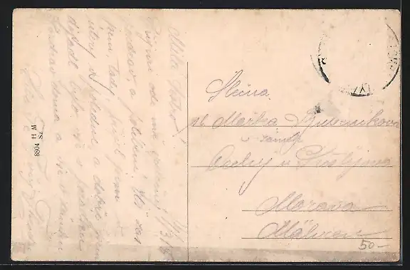 Personenbezogene Daten auf der Rückseite der Karte wurden durch blauen Textmarker unkenntlich gemacht. Die blauen Stellen sind auf die Vorderseite durchgeweicht und wirken sich negativ auf das Postkartenfoto aus