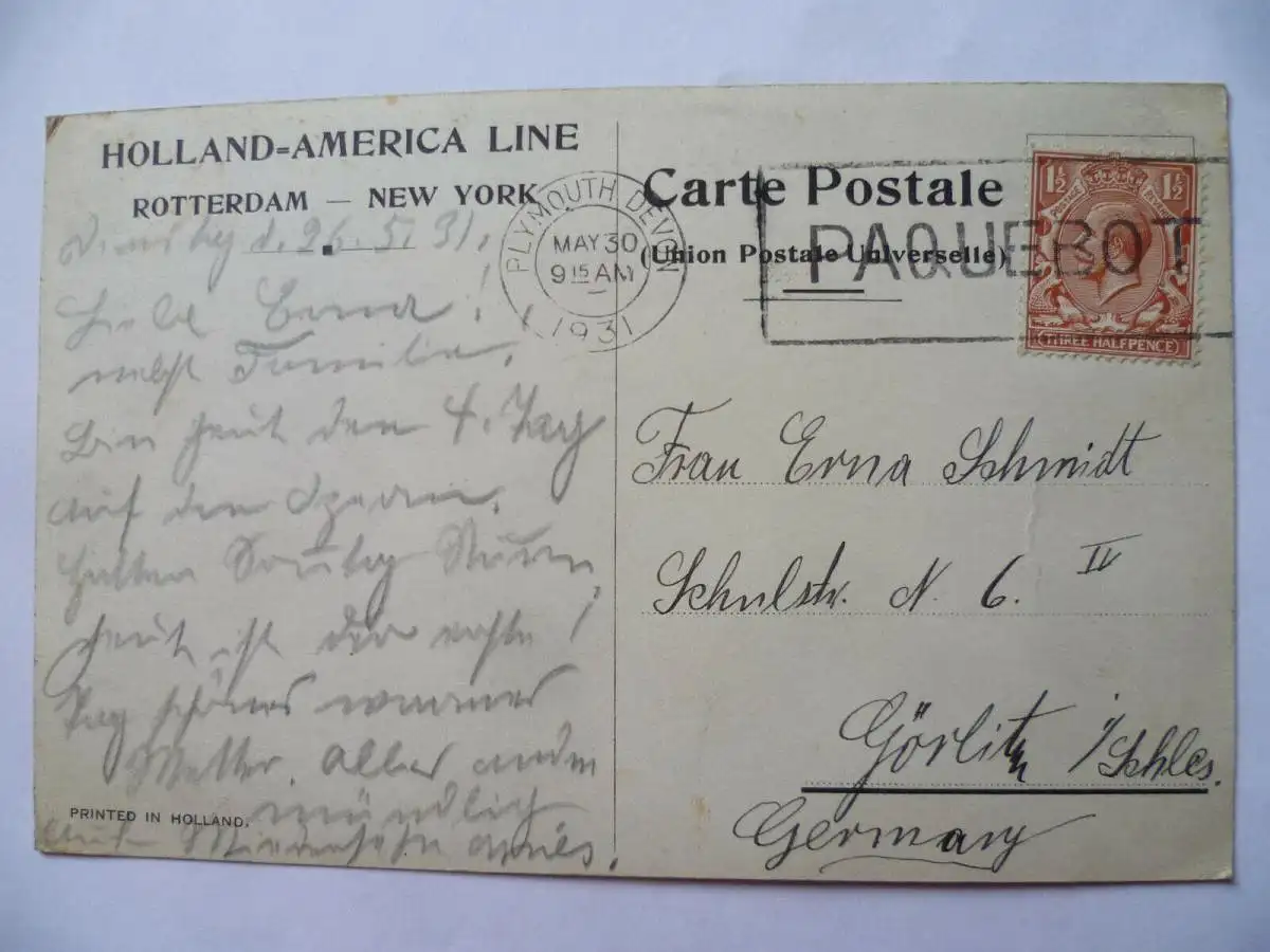 Gelaufen 1931 mit Schiffspoststempel Plymouth Paquetbot. Gut erhalten.
