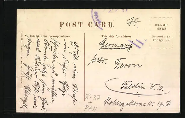 Personenbezogene Daten auf der Rückseite der Karte wurden durch blauen Textmarker unkenntlich gemacht. Die blauen Stellen sind auf die Vorderseite durchgeweicht und wirken sich negativ auf das Postkartenfoto aus