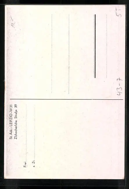 Personenbezogene Daten auf der Rückseite der Karte wurden durch blauen Textmarker unkenntlich gemacht. Die blauen Stellen sind auf die Vorderseite durchgeweicht und wirken sich negativ auf das Postkartenfoto aus