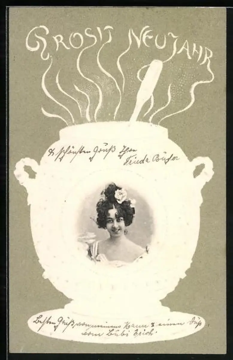 AK Tänzerin im Porträt, Saharet, Prosit Neujahr