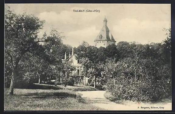 AK Talmay, Vue sur un bâtiment entouré d`arbres et une tour en arrière-plan