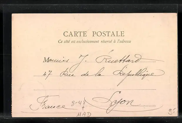 Personenbezogene Daten auf der Rückseite der Karte wurden durch blauen Textmarker unkenntlich gemacht. Die blauen Stellen sind auf die Vorderseite durchgeweicht und wirken sich negativ auf das Postkartenfoto aus