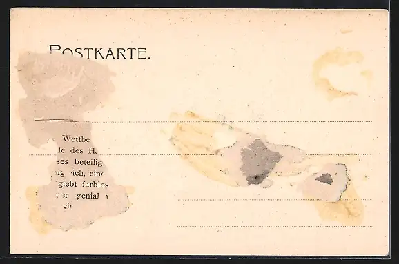 Personenbezogene Daten auf der Rückseite der Karte wurden durch blauen Textmarker unkenntlich gemacht. Die blauen Stellen sind auf die Vorderseite durchgeweicht und wirken sich negativ auf das Postkartenfoto aus