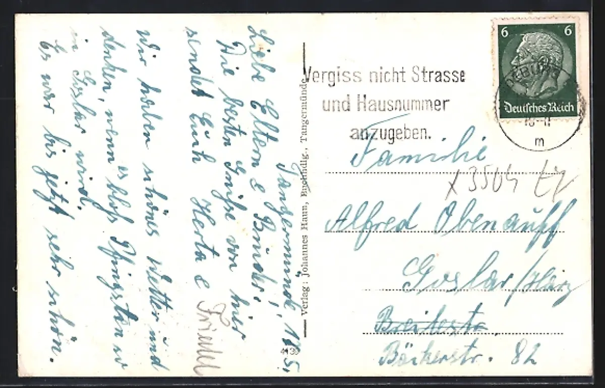 Personenbezogene Daten auf der Rückseite der Karte wurden durch blauen Textmarker unkenntlich gemacht. Die blauen Stellen sind auf die Vorderseite durchgeweicht und wirken sich negativ auf das Postkartenfoto aus