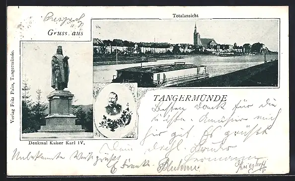 AK Tangermünde, Totalansicht und Denkmal Kaiser Karl IV.