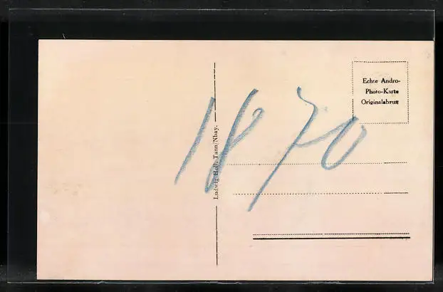 Personenbezogene Daten auf der Rückseite der Karte wurden durch blauen Textmarker unkenntlich gemacht. Die blauen Stellen sind auf die Vorderseite durchgeweicht und wirken sich negativ auf das Postkartenfoto aus